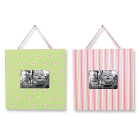Add character and style to your child's room or play area with our Tiptoe Tulip 2 Picture Frame Set" Item # 101706 by Trend Lab Baby. Tiptoe Tulip frame set contains 2 solid wood frame frames, 1 Pink and Sage Mini Dot Print, 1 Pink and Sage Pinstripe Prin. Each frame measures 11 ½ x 11 ½ with a 12" x 5/8" satin ribbon for hanging and holds a 4" x 6" photo. The Tiptoe Tulip Picture Frame Set are a great find and can even coordinate with your Tiptoe Tulip Nursery and Toddler Bedding!